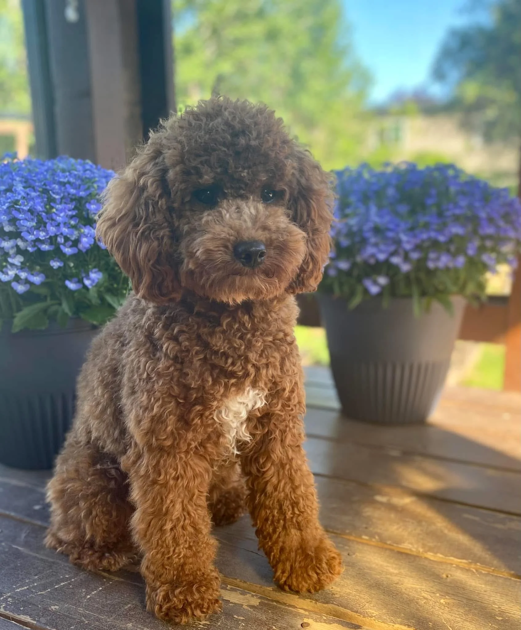 Lotus is our beloved and loyal Blue Merle Labradoodle. Embark Tested, Lotus is a delightful companion, weighing 25 lbs with a lean poodle build. Her agility makes her fantastic for West Coast adventures, as she stays close and boasts excellent off-leash recall. Whether she's enjoying tranquil days at home cuddling or embarking on thrilling escapades, she radiates joy and enthusiasm. Furthermore, Lotus possesses hypoallergenic and non-shedding qualities, and her curly coat is fully furnished and irresistibly soft, akin to a cloud.